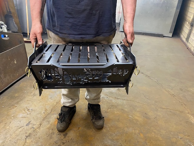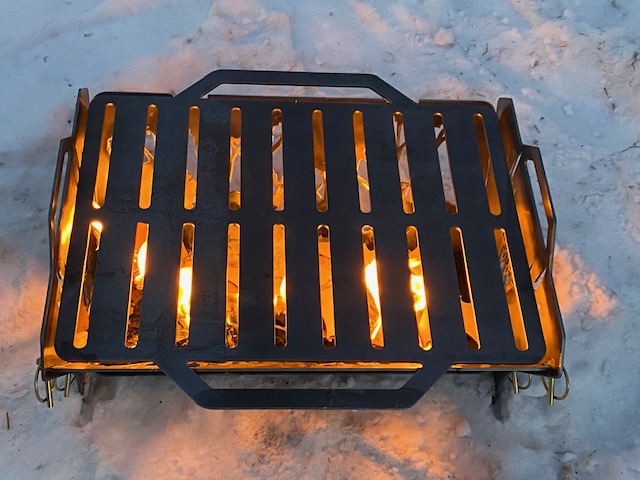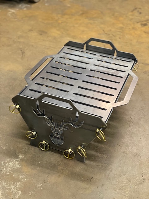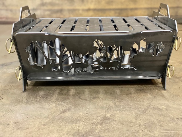 Perfect portable, collapsible fire pit to take camping or out in the bush. Disassembles quick and easy by removing the pins. Lays flat for easy transport and storage. Features a deer head on front and back and deer scene with trees in the side panels.