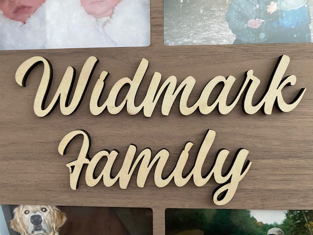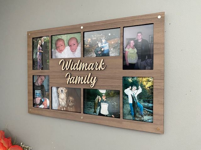 Laser cut from birch plywood on the back with walnut plywood front. Has an acrylic sheet in the middle to protect your photos. Adding photos to your collage is very easy with scribed lines on the back for perfect placement. Recommend to use double sided tape to ensure your pictures won’t move. Simply unscrew the binding screws to add or replace your pictures. Has a sawtooth hanger for mounting.