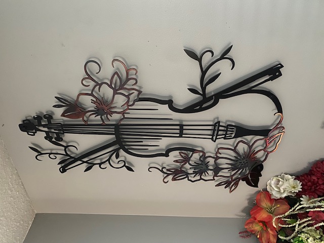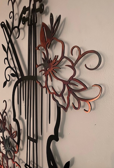 Strike a chord in great music home decor and keep up with the latest decor trend of metal signs with this flower violin. Featuring Our flower violin double layered, powder coated black with patina accents. Comes with 1″ standoffs for mounting to add depth to your wall art. This metal guitar art is the perfect metal home decor for those who love music!