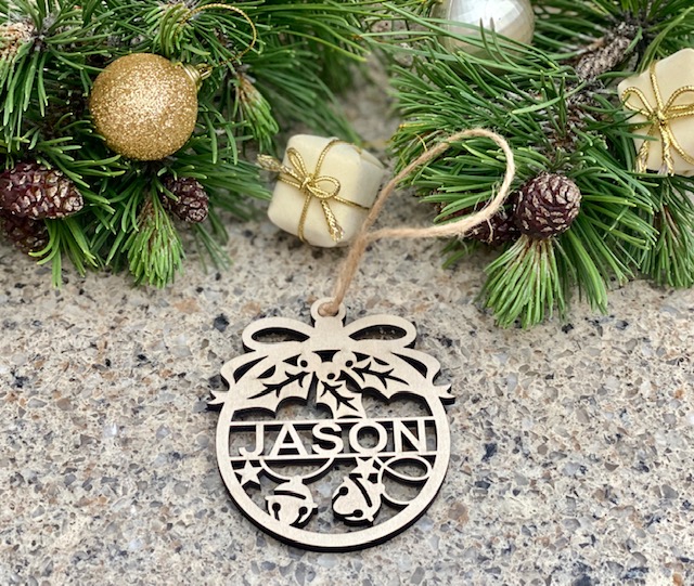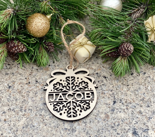 Each Christmas ornament is laser cut from 1/8″ wood, personalized with your name and includes twine for hanging.